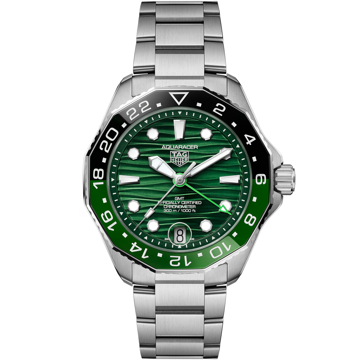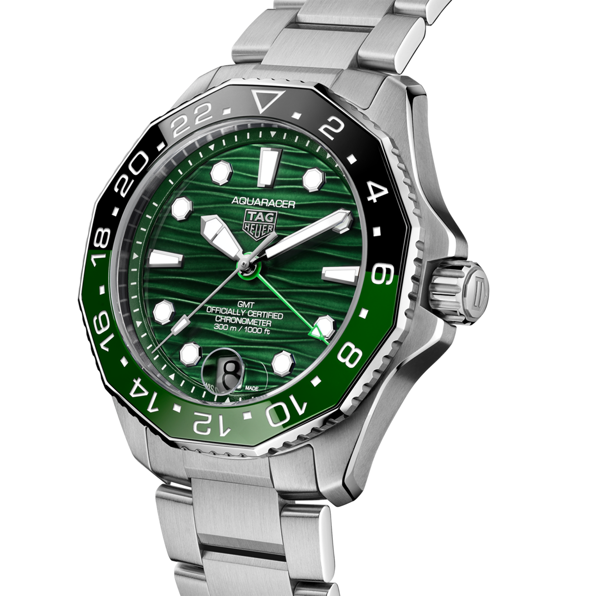 С универсальными часами TAG Heuer Aquaracer Professional 300 Вы будете чувствовать себя в море так же привычно, как и на суше. Эта модель диаметром 42 мм с мощным механизмом TH31-03, созданная для тех, кто любит адреналин, поможет Вам в любом предприятии. Насыщенно-зеленый матовый циферблат с эффектом Sunray, люминесцентными белыми стрелками и часовыми метками Super-LumiNova®, а также яркой светло-зеленой стрелкой GMT. Часы оснащены сертифицированным COSC калибром TH31-03 с 80-часовым запасом хода и хронометром GMT, позволяющим следить за временем в путешествиях по семи морям.