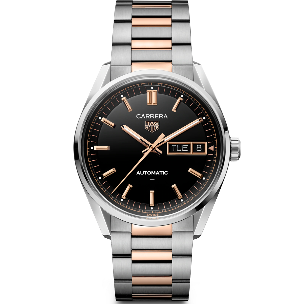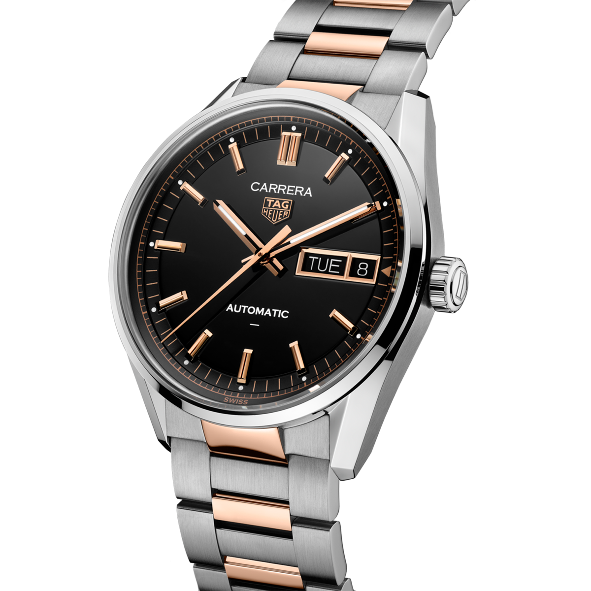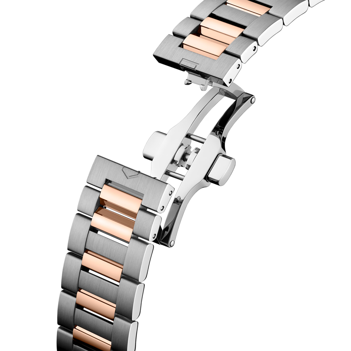 Роскошная версия часов TAG Heuer Carrera Day-Date с матовым корпусом из стали и золота 18 карат 5N привносит в коллекцию нотку утонченности. Она оснащена механизмом TH31-02 и представляет собой идеальное сочетание элегантности и функциональности. Чёрный опаловый циферблат с индексами и стрелками, покрытыми розовым золотом 18 карат 5N, излучает роскошь. Полированный стальной корпус создаёт яркий контраст, превращая эти часы в утверждение стиля. На задней крышке выгравирован Венок Победы – символ успешной истории часов Carrera. Матовый Н-образный браслет из стали и золота 18 карат 5N сочетает в себе универсальность и элегантность. Браслет удобно и надёжно фиксируется на руке благодаря двойной раскладывающейся застежке.
