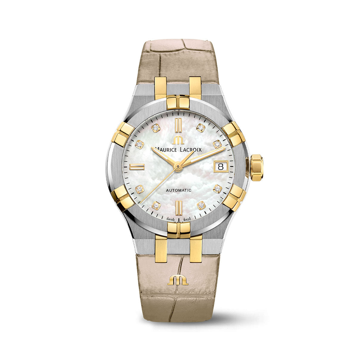 - РЕМЕШОК: Бежевый ремешок из телячьей кожи с логотипом Maurice Lacroix «m».